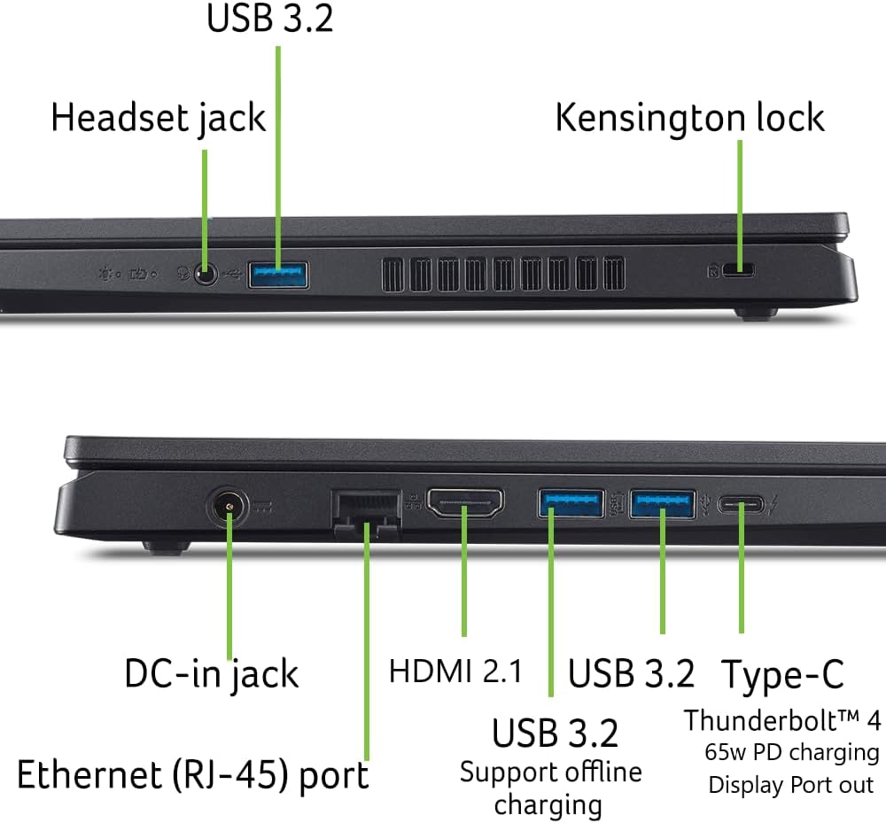 Ports For All Your Accessories: 1 – USB Type-C Port USB 3.2 Gen 2 (up to 10 Gbps) DisplayPort over USB Type-C, Thunderbolt 4 & USB Charging, 1 – USB 3.2 Gen 1 Port (Featuring Power-off Charging), 2 – USB 3.2 Gen 1 ports, 1 – HDMI 2.1 Port with HDCP support, 1 – Headphone/Speaker/Line-out Jack, 1 – Ethernet (RJ-45), DC-in for AC adapter, 1 – Kensington Lock Slot